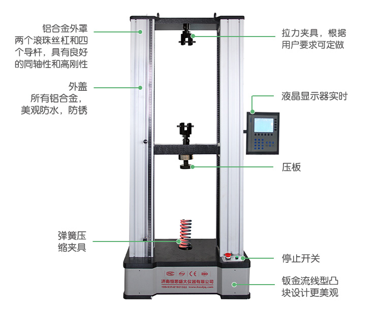 本機(jī)依據(jù)國(guó)家彈簧拉壓試驗(yàn)機(jī)標(biāo)準(zhǔn)規(guī)定的技術(shù)要求制成,專業(yè)設(shè)計(jì)的自動(dòng)控制和數(shù)據(jù)采集系統(tǒng),實(shí)現(xiàn)了數(shù)據(jù)采集和控制過(guò)程的全數(shù)字化調(diào)整。能對(duì)拉簧、壓簧、碟簧、塔簧、板簧、卡簧、片彈簧、復(fù)合彈簧、氣彈簧、模具彈簧、異形彈簧等精密彈簧的拉力、壓力、位移、剛度等強(qiáng)度試驗(yàn)和分析。